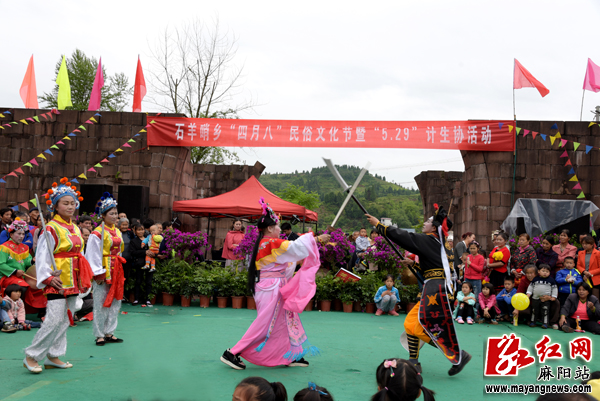 5月15日农历四月初九,石羊哨乡“四月八”民俗文化节暨“5.29”计生协活动在该乡通达林村隆重举行。来自我县石羊哨乡、谭家寨乡及周边凤凰县的近20支文艺队伍共300余位演员,为从怀化市区、麻阳、凤凰等市县前来观看的千余位观众表演了花灯戏、山歌对唱、苗族舞蹈、快板、独唱等23个精彩的文艺节目。