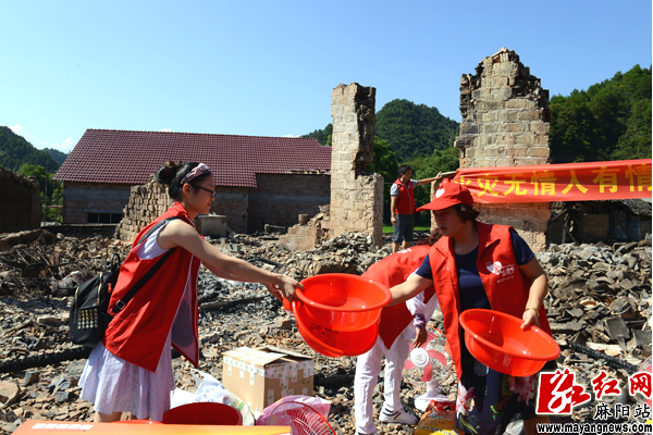 7 月25日,麻阳“爱在苗乡”志愿者协会的志愿者们身着红马褂,扛着红旗,提着大米、食用油、风扇等生活物资,顶着酷暑赶往锦和镇新场村火灾受灾现场。