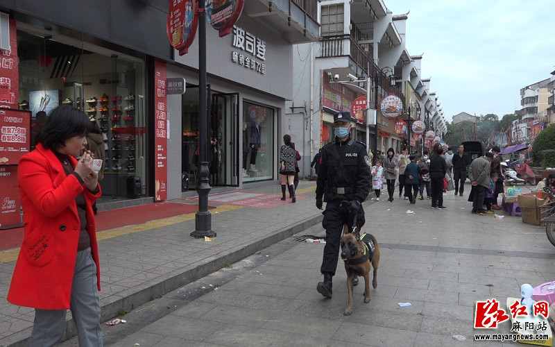 大年初二,记者在步行街正门入口处看到,“闪电”正和他的同事在站岗执勤,训导员一声令下,警犬“闪电”立马紧随巡逻队伍,观察四周。