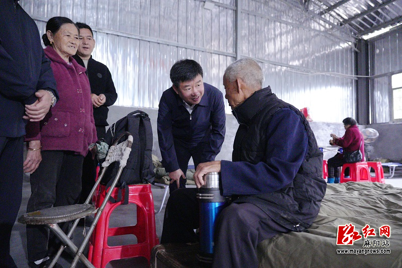 县委书记江涛在隆家堡乡步云坪村应急转移集中安置点,与群众交谈,详细了解基本生活保障情况。