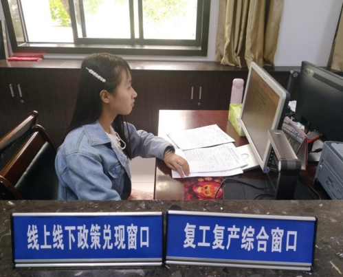 (图为县政务服务中心设立复工复产线上线下政策兑现窗口)