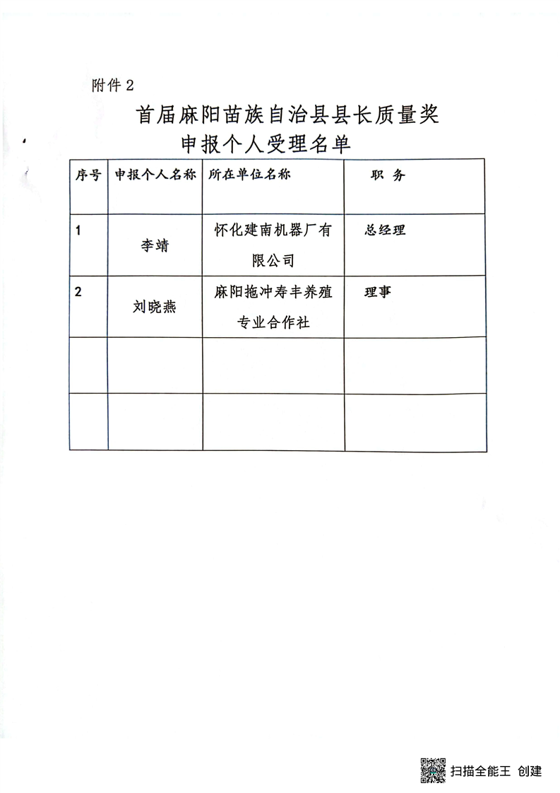 麻阳苗族自治县质量强县领导小组办公室关于首届麻阳苗族自治县县长质量奖受理名单的公示 麻阳苗族自治县人民政府 http://www.mayang.gov.cn 发布时间: 2023-10-25 16:14 【字体:大 小】 分享到 来源:麻阳县市场监管局 作者: