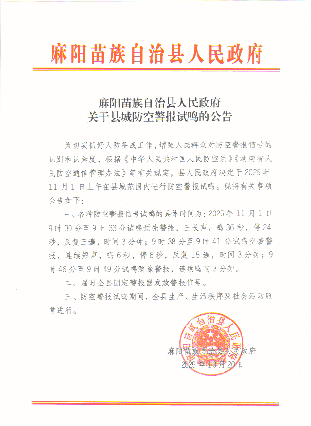 麻阳苗族自治县人民政府关于县城防空警报试鸣的公告 麻阳苗族自治县人民政府 http://www.mayang.gov.cn 发布时间: 2025-10-31 15:19 【字体:大 小】 分享到 来源:麻阳县国防办 作者: