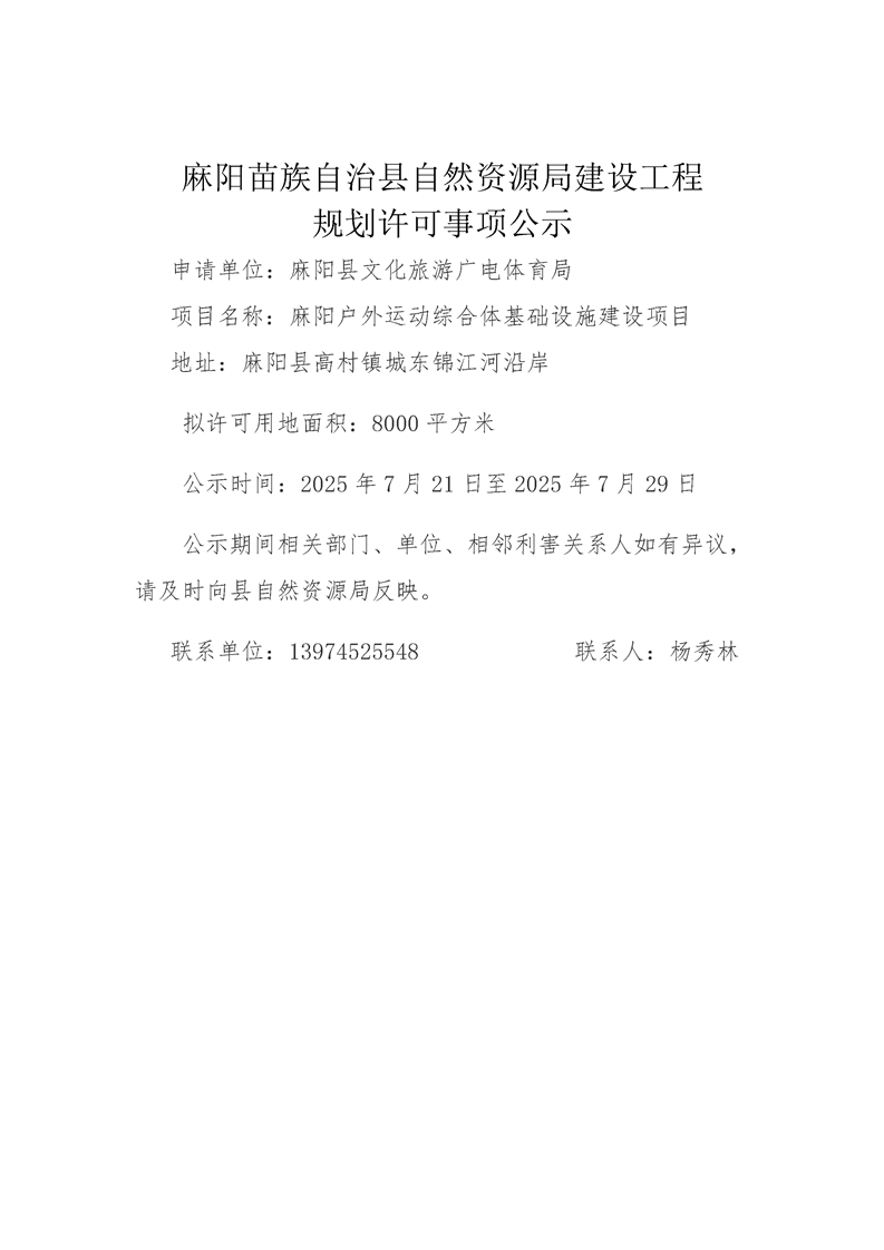 麻阳县户外运动综合体基础设施建设工程规划许可公示 麻阳苗族自治县人民政府 http://www.mayang.gov.cn 发布时间: 2025-07-21 14:41 【字体:大 小】 分享到 来源:麻阳县自然资源局 作者: