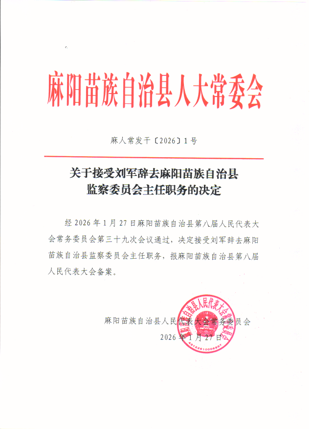 关于接受刘军辞去麻阳苗族自治县监察委员会主任职务的决定 麻阳苗族自治县人民政府 http://www.mayang.gov.cn 发布时间: 2026-01-27 15:28 【字体:大 小】 分享到 来源:县人大 作者: