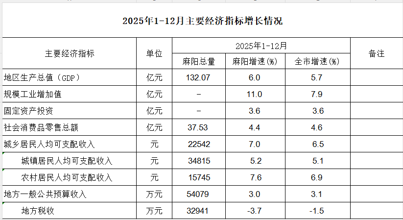 麻阳苗族自治县2025年1-12月主要经济指标完成情况 麻阳苗族自治县人民政府 http://www.mayang.gov.cn 发布时间: 2026-02-03 10:22 【字体:大 小】 附件:麻阳苗族自治县2025年1-12月主要经济指标完成情况 分享到 来源:麻阳县统计局 作者: