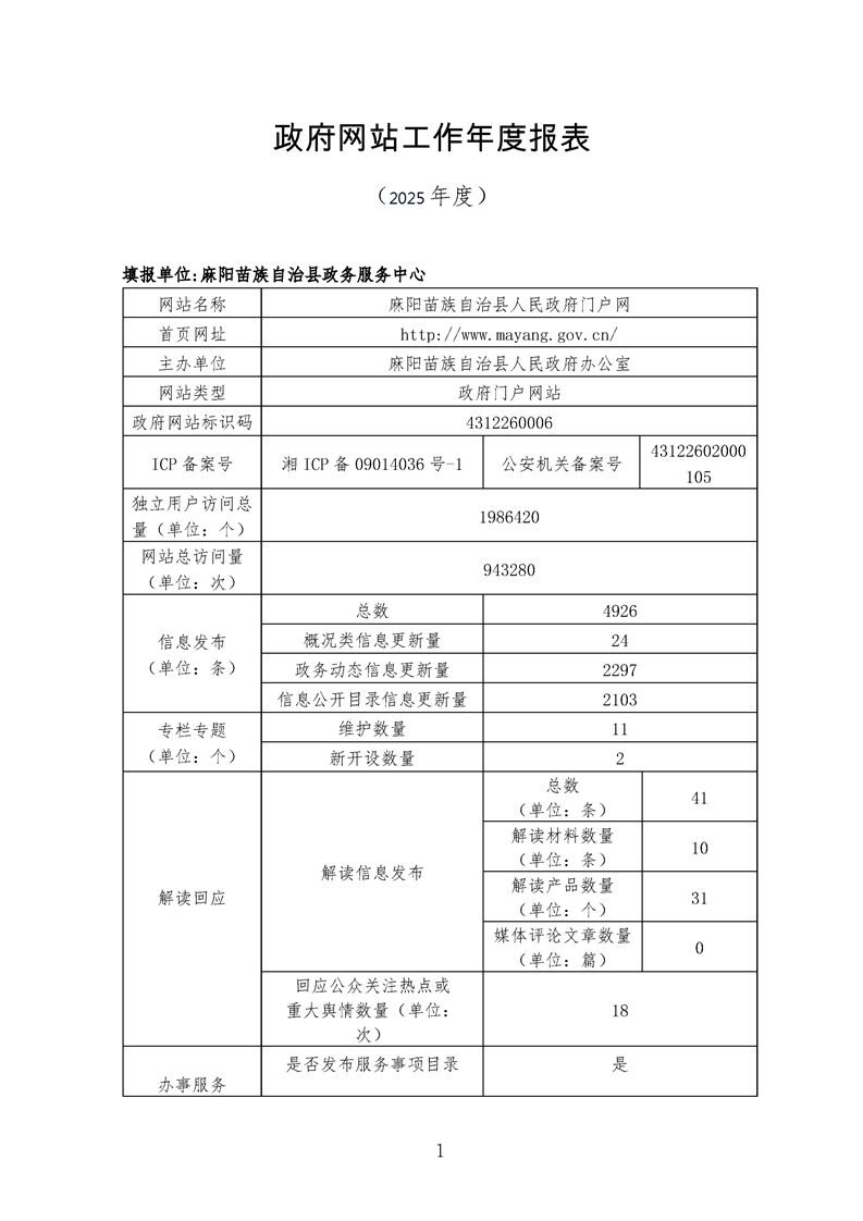 麻阳苗族自治县政府网站工作年度报表(2025年) 麻阳苗族自治县人民政府 http://www.mayang.gov.cn 发布时间: 2026-01-06 15:55 【字体:大 小】 分享到 来源:麻阳县政务服务中心 作者: