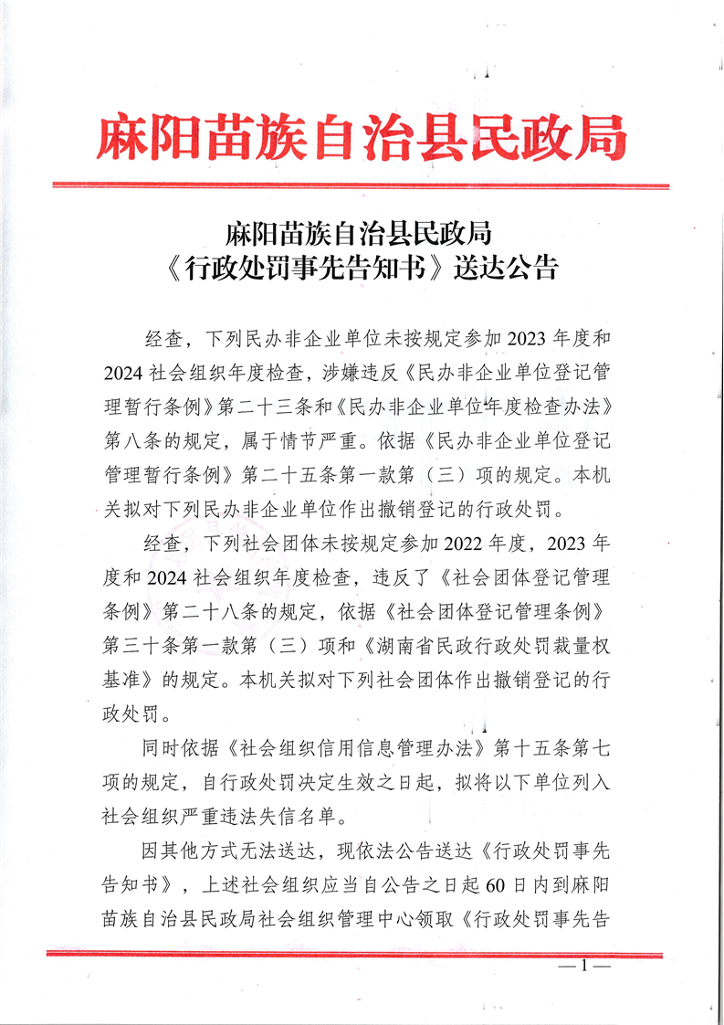 麻阳苗族自治县民政局《行政处罚事先告知书》送达公告 麻阳苗族自治县人民政府 http://www.mayang.gov.cn 发布时间: 2025-11-10 13:25 【字体:大 小】 分享到 来源:麻阳县民政局 作者:
