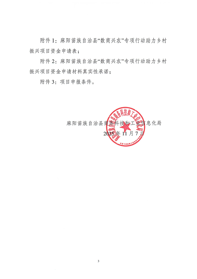 关于开展麻阳苗族自治县“数商兴农”助力乡村振兴项目资金申报的通知 麻阳苗族自治县人民政府 http://www.mayang.gov.cn 发布时间: 2025-11-10 11:15 【字体:大 小】 分享到 来源:麻阳县商务科技和工业信息化局 作者: