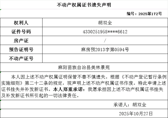 不动产权属证书遗失声明(胡双全) 麻阳苗族自治县人民政府 http://www.mayang.gov.cn 发布时间: 2025-10-27 15:59 【字体:大 小】 分享到 来源:麻阳县自然资源局 作者: