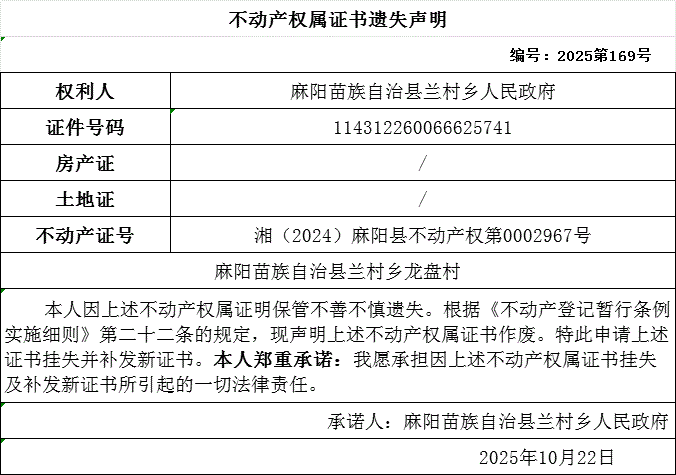 不动产权属证书遗失声明(兰村乡人民政府) 麻阳苗族自治县人民政府 http://www.mayang.gov.cn 发布时间: 2025-10-23 08:54 【字体:大 小】 分享到 来源:麻阳县自然资源局 作者: