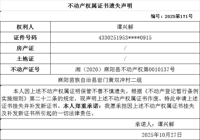 不动产权属证书遗失声明(谭兴解) 麻阳苗族自治县人民政府 http://www.mayang.gov.cn 发布时间: 2025-10-28 16:01 【字体:大 小】 分享到 来源:麻阳县自然资源局 作者: