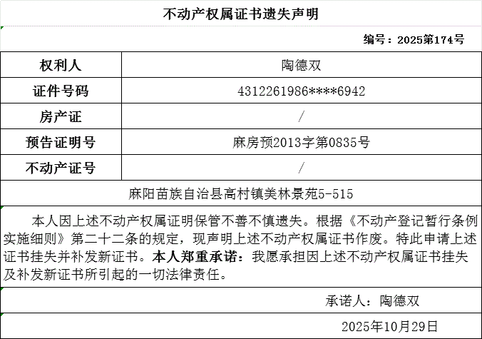 不动产权属证书遗失声明(陶德双) 麻阳苗族自治县人民政府 http://www.mayang.gov.cn 发布时间: 2025-11-03 15:31 【字体:大 小】 分享到 来源:麻阳县自然资源局 作者: