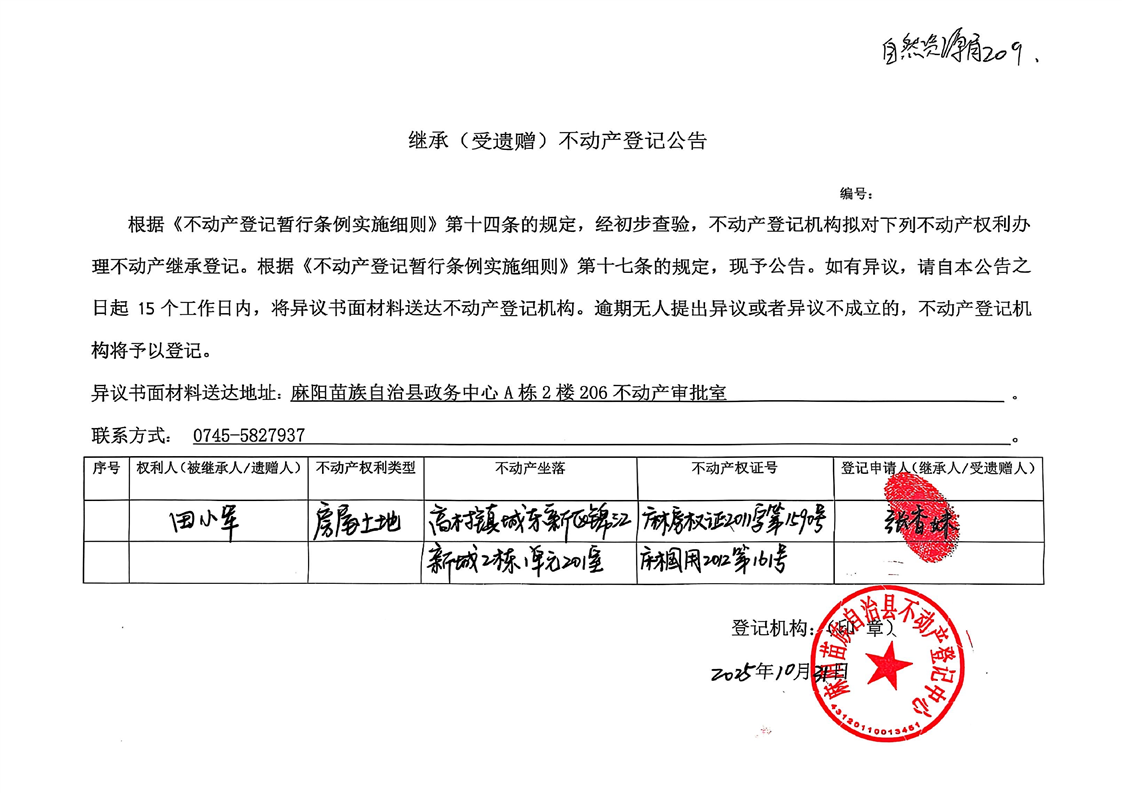 继承(受遗赠)不动产登记公告(张香妹) 麻阳苗族自治县人民政府 http://www.mayang.gov.cn 发布时间: 2025-10-31 15:24 【字体:大 小】 分享到 来源:麻阳县自然资源局 作者: