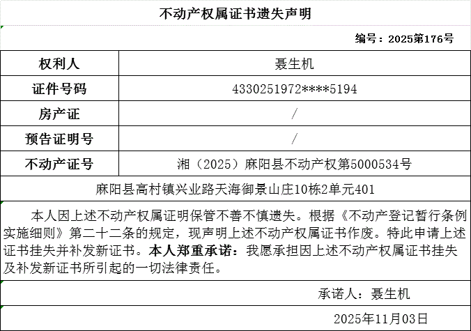 不动产权属证书遗失声明(聂生机) 麻阳苗族自治县人民政府 http://www.mayang.gov.cn 发布时间: 2025-11-03 15:32 【字体:大 小】 分享到 来源:麻阳县自然资源局 作者:
