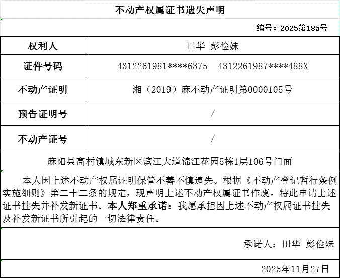不动产权属证书遗失声明(田华 彭俭妹) 麻阳苗族自治县人民政府 http://www.mayang.gov.cn 发布时间: 2025-11-28 14:36 【字体:大 小】 分享到 来源:麻阳县自然资源局 作者: