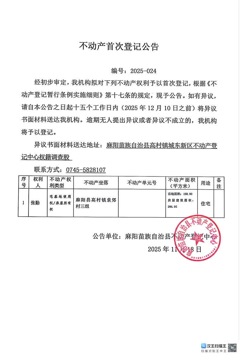不动产首次登记公告(张勤) 麻阳苗族自治县人民政府 http://www.mayang.gov.cn 发布时间: 2025-11-18 08:46 【字体:大 小】 分享到 来源:麻阳县自然资源局 作者: