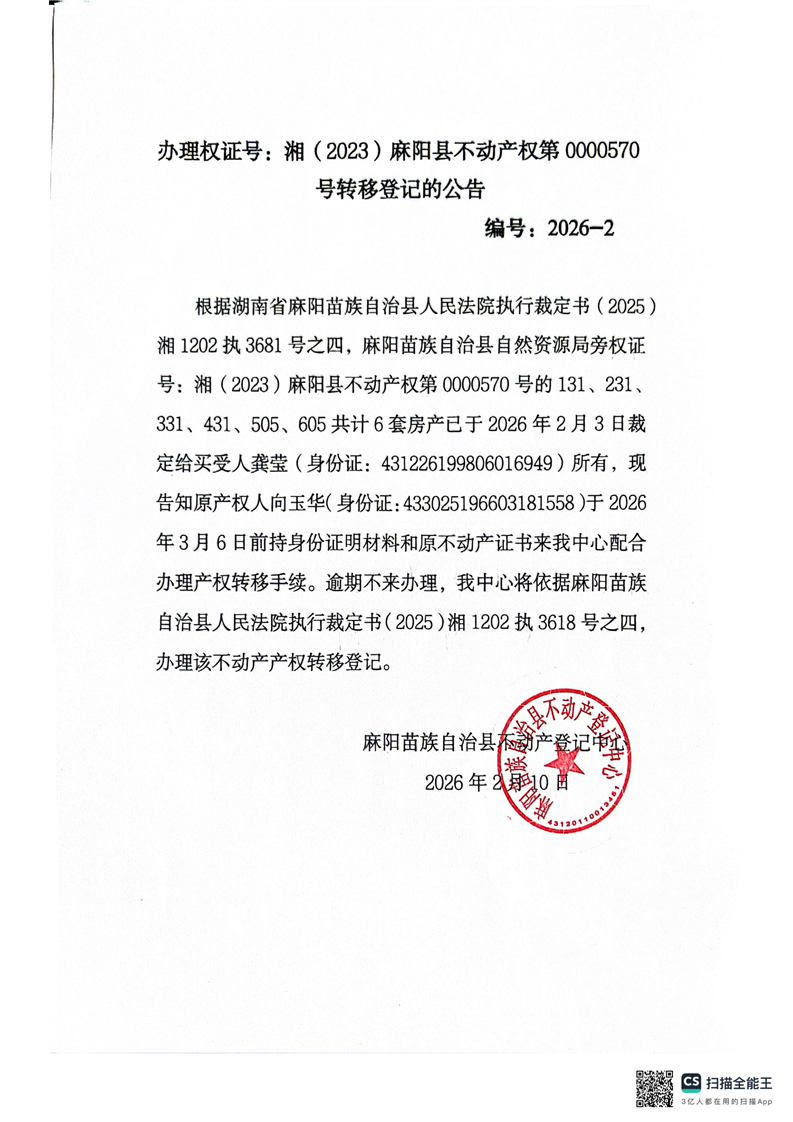 办理权证号:湘(2023)麻阳县不动产权第0000570号转移登记的公告 麻阳苗族自治县人民政府 http://www.mayang.gov.cn 发布时间: 2026-02-11 08:24 【字体:大 小】 分享到 来源:麻阳县自然资源局 作者: