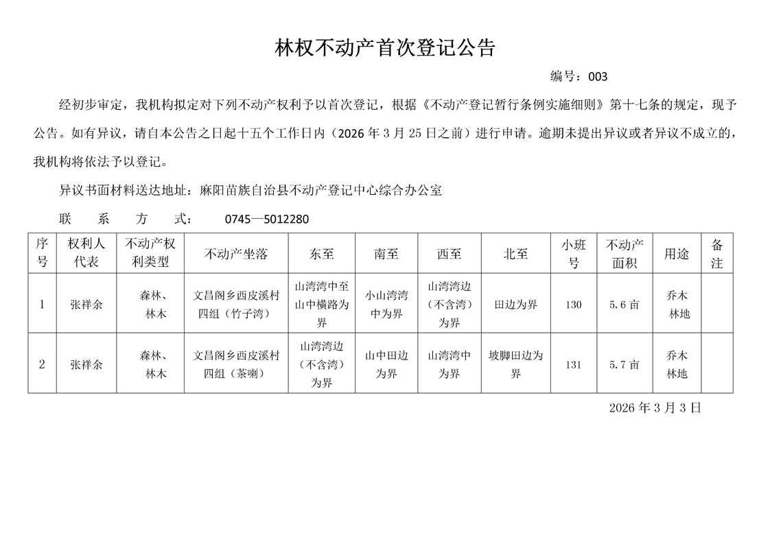 林权不动产首次登记公告(张祥余) 麻阳苗族自治县人民政府 http://www.mayang.gov.cn 发布时间: 2026-03-03 15:03 【字体:大 小】 分享到 来源:麻阳县自然资源局 作者: