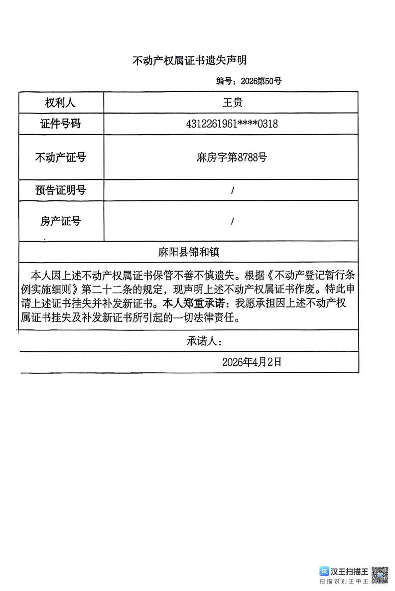 王贵不动产权属证书遗失声明 麻阳苗族自治县人民政府 http://www.mayang.gov.cn 发布时间: 2026-04-08 14:37 【字体:大 小】 分享到 来源:麻阳县自然资源局 作者: