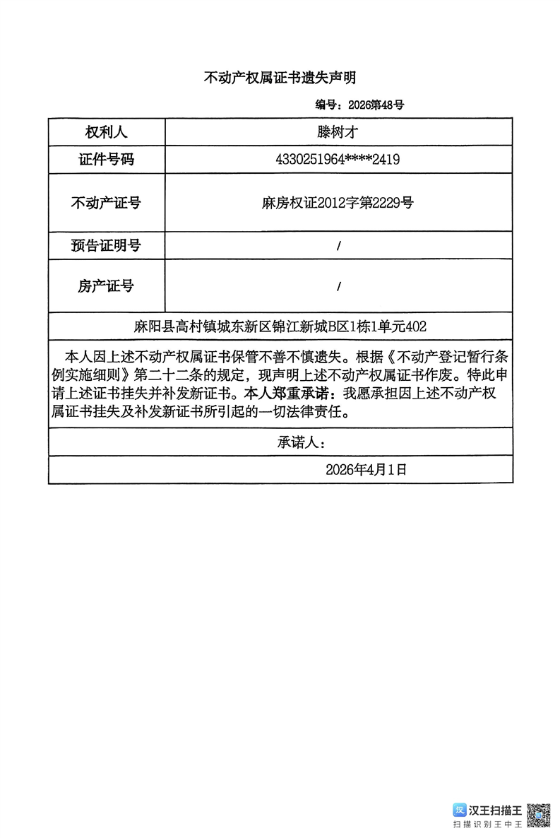 滕树才不动产权属证书遗失声明 麻阳苗族自治县人民政府 http://www.mayang.gov.cn 发布时间: 2026-04-08 14:48 【字体:大 小】 分享到 来源:麻阳县自然资源局 作者: