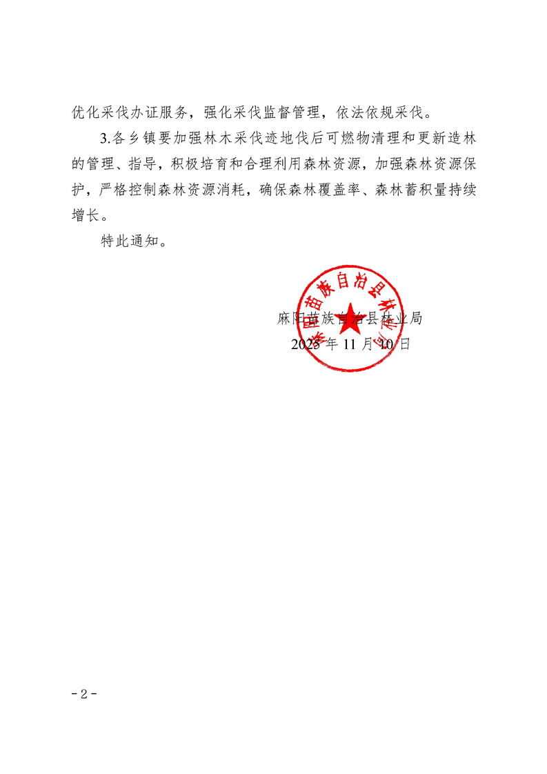 关于追加2025年度森林采伐限额主伐计划的通知 麻阳苗族自治县人民政府 http://www.mayang.gov.cn 发布时间: 2025-11-10 11:30 【字体:大 小】 分享到 来源:麻阳县林业局 作者: