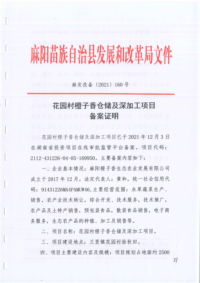 花园村橙子香仓储及深加工项目备案证明 麻阳苗族自治县人民政府 http://www.mayang.gov.cn 发布时间: 2021-12-06 16:31 【字体:大 小】 分享到 来源:麻阳县发改局 作者:
