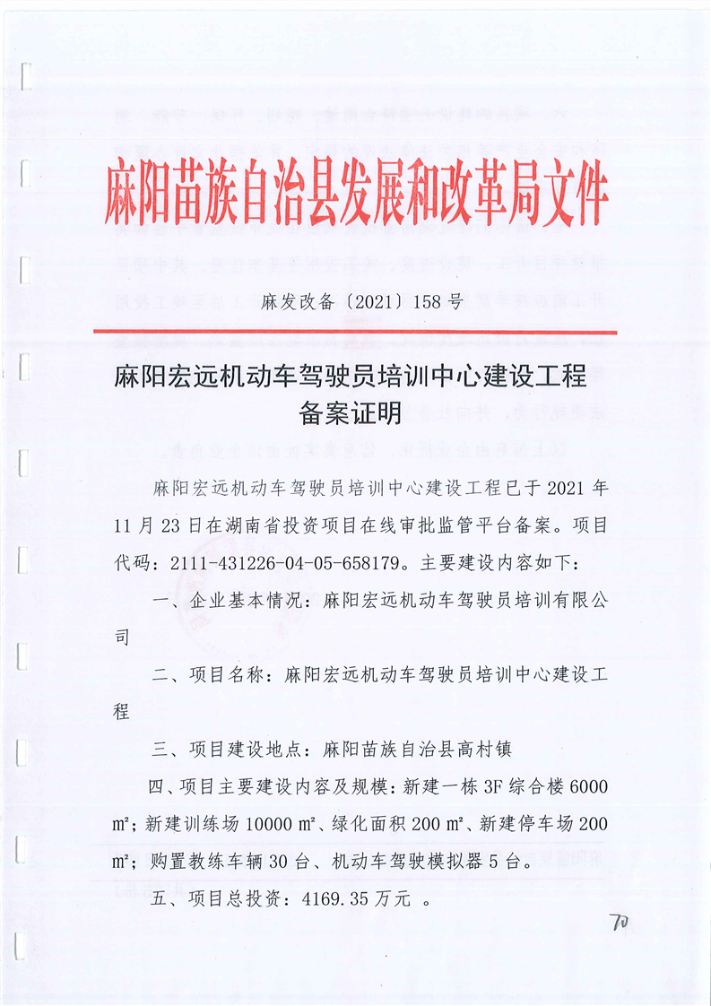 麻阳宏远机动车驾驶员培训中心建设工程备案证明 麻阳苗族自治县人民政府 http://www.mayang.gov.cn 发布时间: 2021-11-26 16:29 【字体:大 小】 分享到 来源:麻阳县发改局 作者: