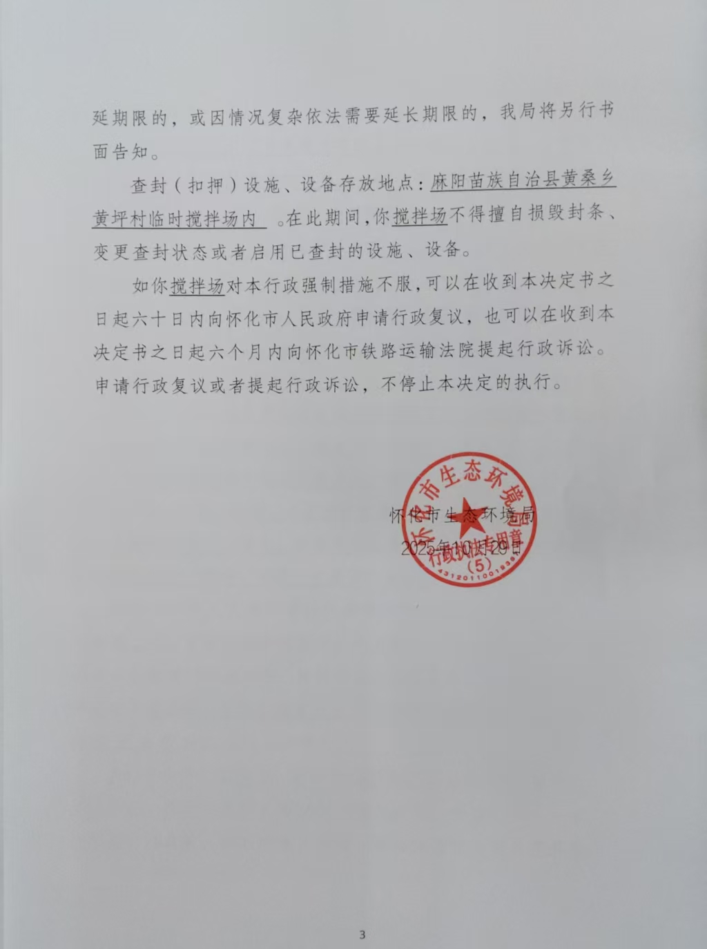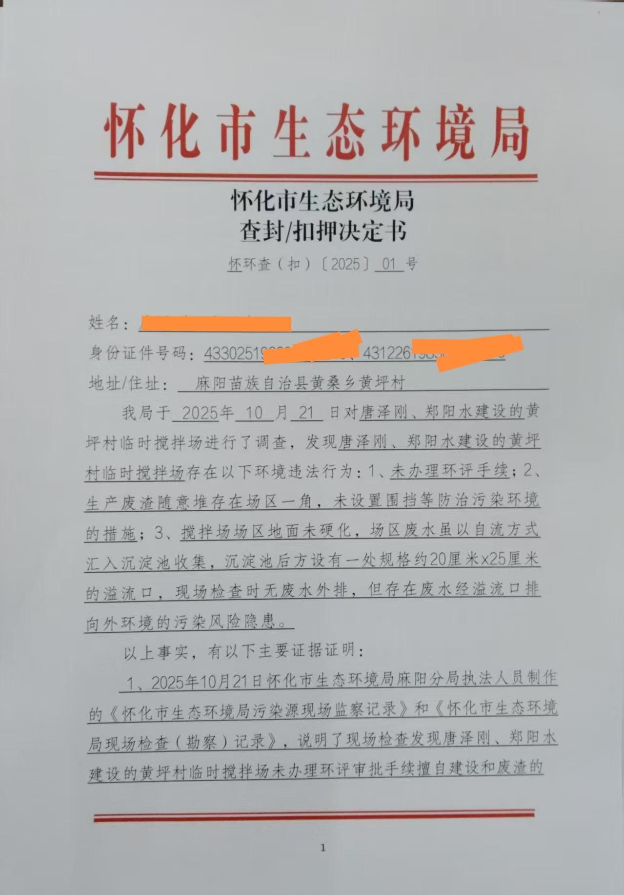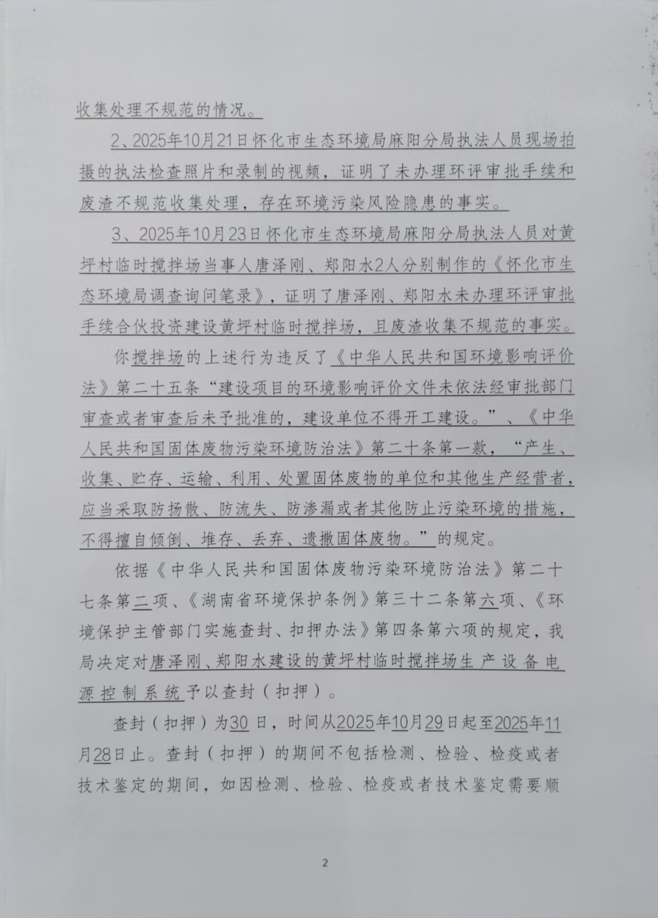 怀化市生态环境局查封、扣押决定书 怀环麻查〔2025〕01号