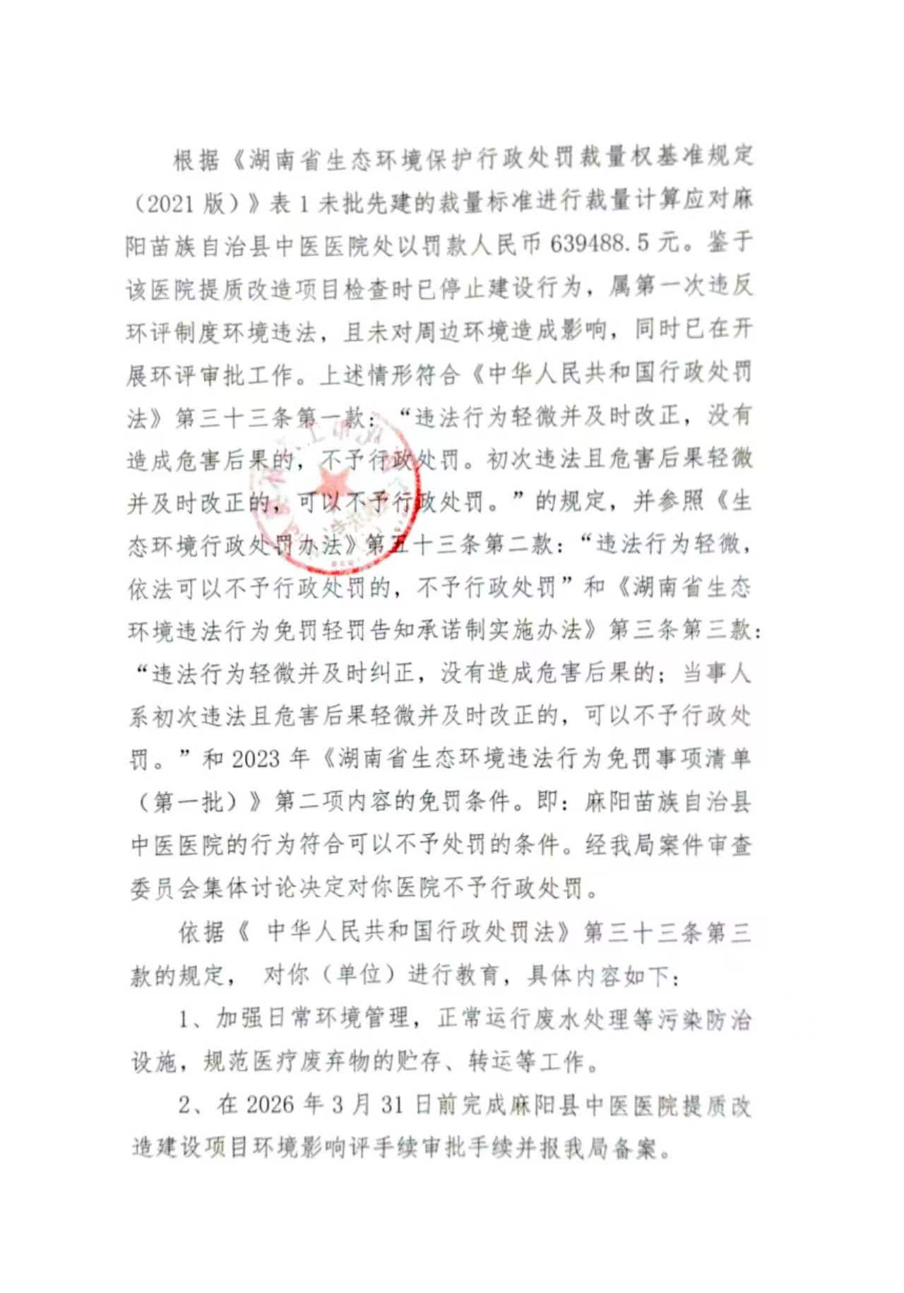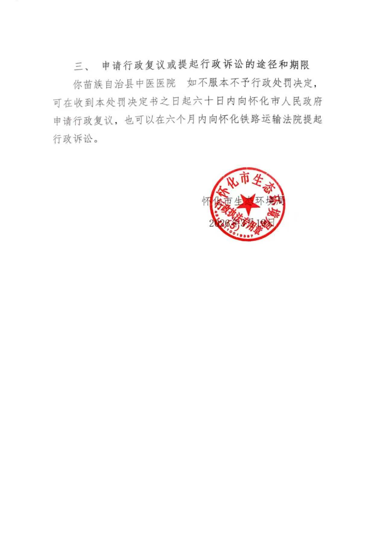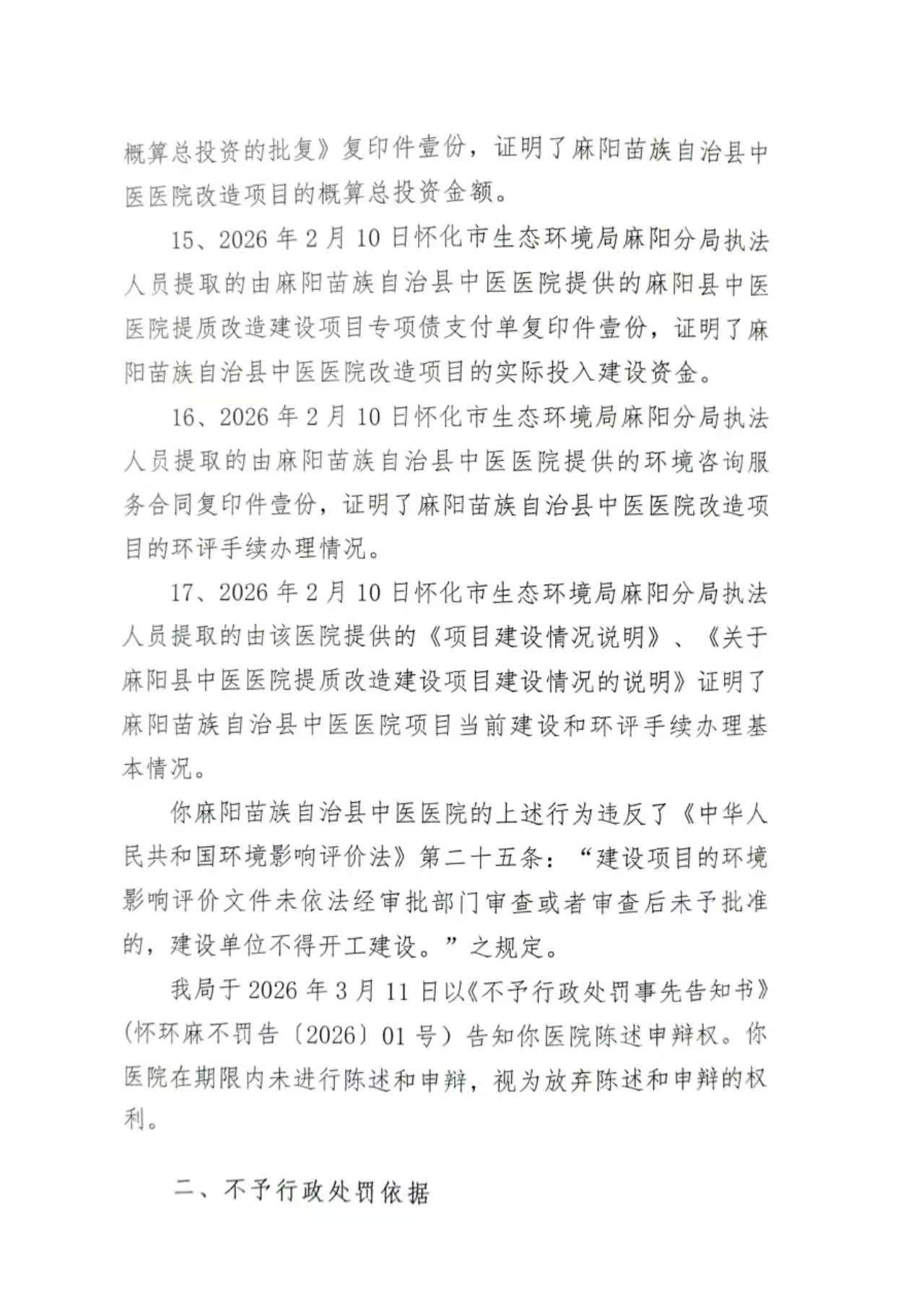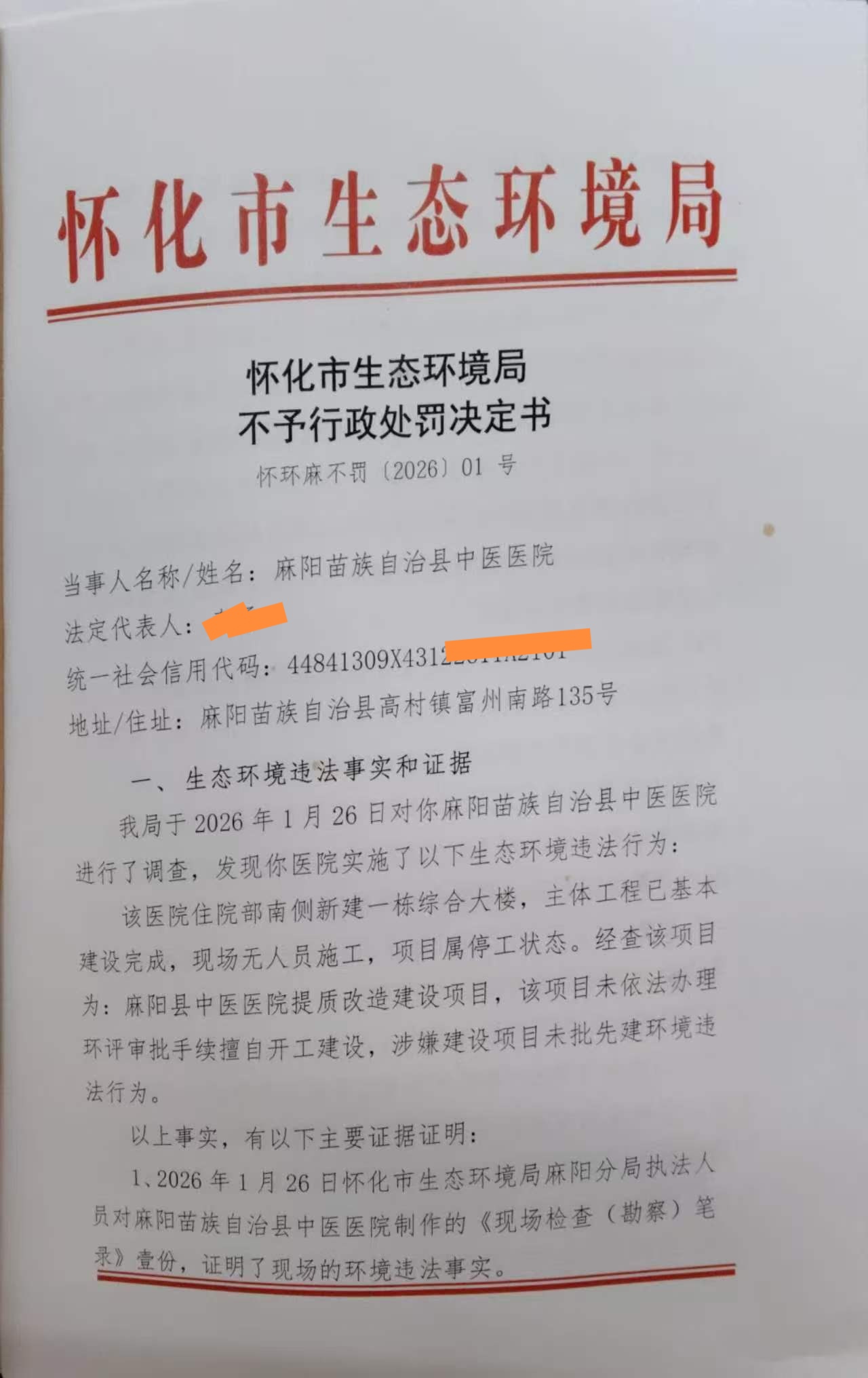 怀化市生态环境局不予行政处罚决定书 怀环麻不罚{2026}01号 麻阳苗族自治县人民政府 http://www.mayang.gov.cn 发布时间: 2026-03-20 09:47 【字体:大 小】 分享到 来源:市生态环境局麻阳分局 作者: