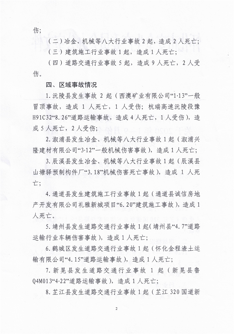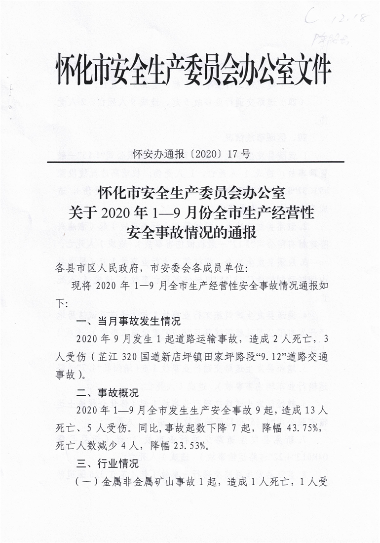 怀化市安全生产委员会办公室关于2020年1-9月份全市生产经营性安全事故情况的通报 麻阳苗族自治县人民政府 http://www.mayang.gov.cn 发布时间: 2020-10-25 16:43 【字体:大 小】 分享到 来源:麻阳县应急局 作者: