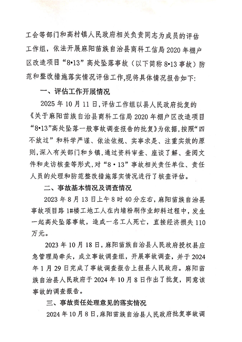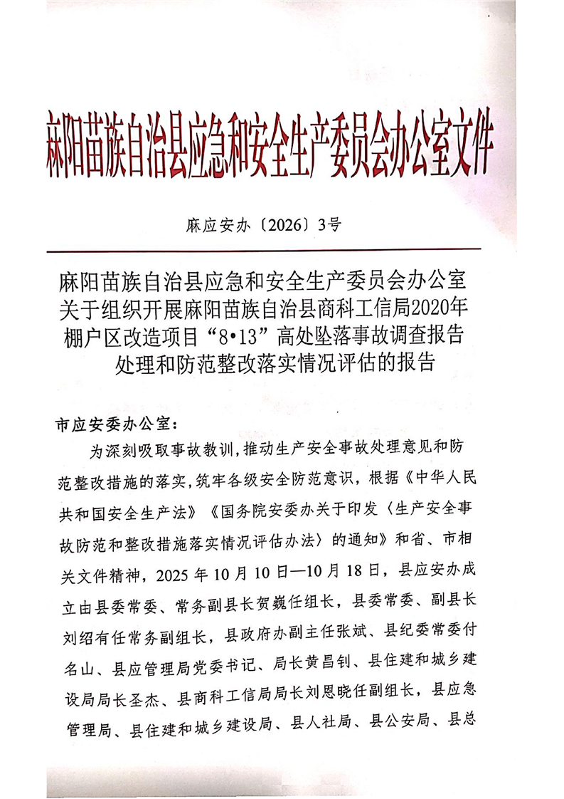 麻阳苗族自治县应急和安全生产委员会办公室关于组织开展麻阳苗族自治县商科工信局2020年棚户区改造项目“8•13”高处坠落事故调查报告处理和防范整改落实情况评估的报告 麻阳苗族自治县人民政府 http://www.mayang.gov.cn 发布时间: 2026-03-30 17:04 【字体:大 小】 分享到 来源:麻阳县应急管理局 作者: