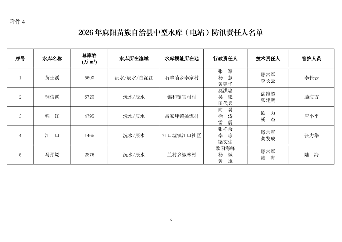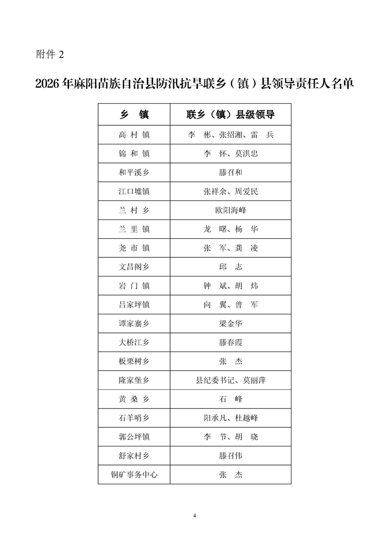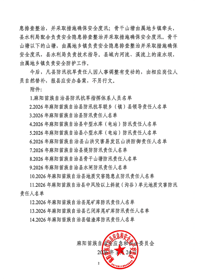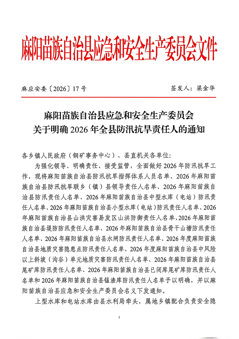 麻应安委〔2026〕17号关于明确2026年全县防汛抗旱责任人的通知 麻阳苗族自治县人民政府 http://www.mayang.gov.cn 发布时间: 2026-04-14 10:46 【字体:大 小】 分享到 来源:麻阳县应急管理局 作者: