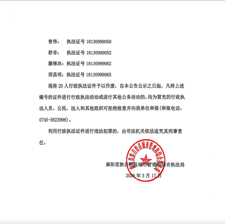 麻阳苗族自治县城市管理和综合执法局关于注销作废行政执法证件的公告 麻阳苗族自治县人民政府 发布时间: 2026-03-17 11:36 【字体:大 小】 分享到 来源:麻阳县城市管理和综合执法局 作者: