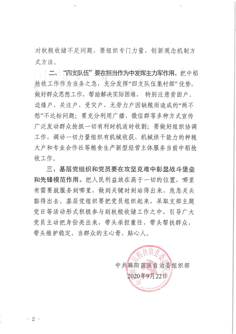 关于依托“四支队伍集村部”优势在全县秋粮收储中充分发挥基层党组织和党员作用的通知 麻阳苗族自治县人民政府 http://www.mayang.gov.cn 发布时间: 2020-09-23 17:23 【字体:大 小】 分享到 来源:县组织部 作者: