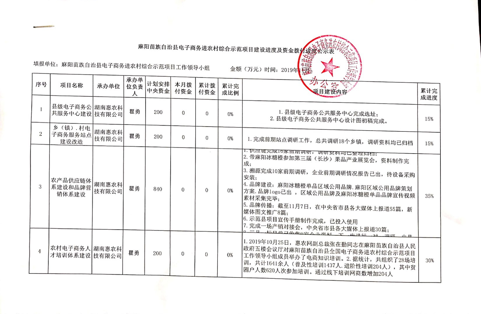 麻阳苗族自治县电子商务进农村综合示范项目建设进度及资金拨付进度公示表 麻阳苗族自治县人民政府 http://www.mayang.gov.cn 发布时间: 2019-11-02 09:36 【字体:大 小】 分享到 来源:麻阳县商务科技和工业信息化局 作者: