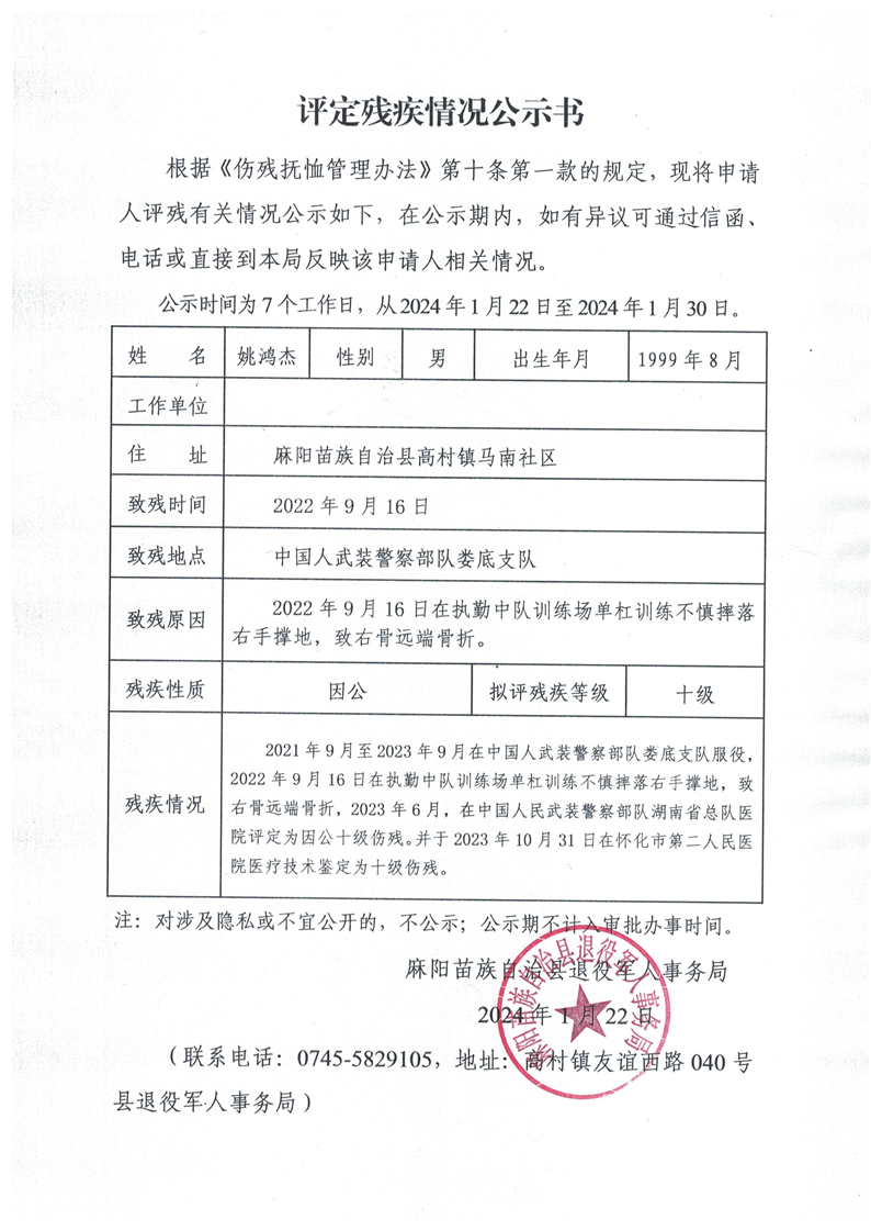 评定残疾情况公示书(姚鸿杰) 麻阳苗族自治县人民政府 http://www.mayang.gov.cn 发布时间: 2024-01-22 08:55 【字体:大 小】 分享到 来源:麻阳苗族自治县退役军人事务局 作者: