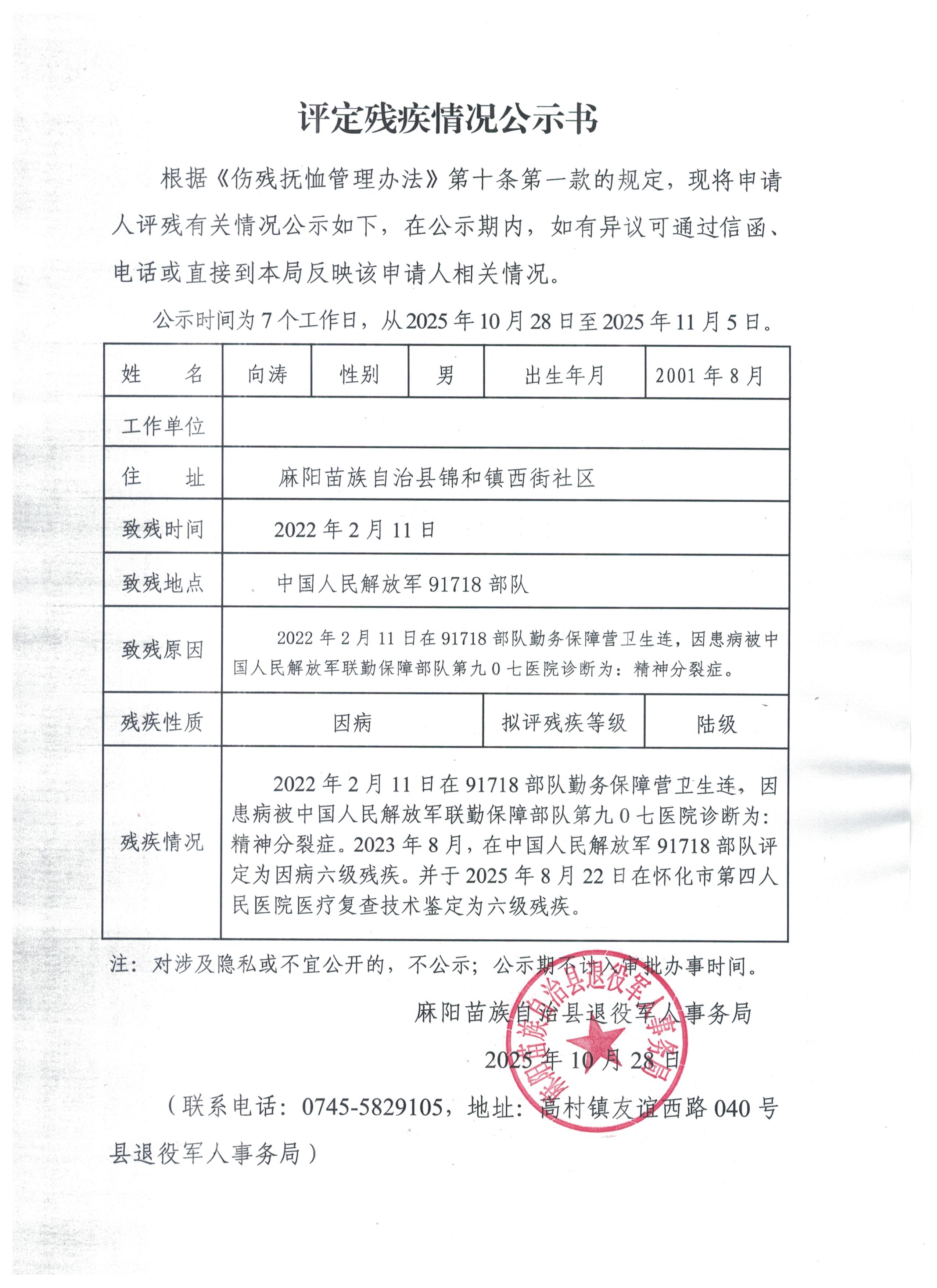 评定残疾情况公示书(向涛) 麻阳苗族自治县人民政府 http://www.mayang.gov.cn 发布时间: 2025-10-28 17:20 【字体:大 小】 分享到 来源:麻阳苗族自治县退役军人事务局 作者: