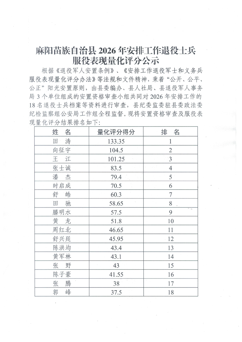 麻阳苗族自治县2026年安排工作退役士兵服役表现量化评分公示 麻阳苗族自治县人民政府 http://www.mayang.gov.cn 发布时间: 2026-04-10 10:20 【字体:大 小】 分享到 来源:中共麻阳苗族自治县委退役军人事务工作领导小组办公室 作者:
