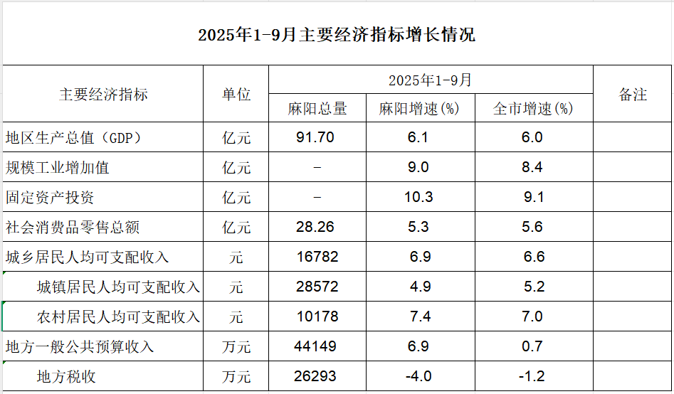 麻阳苗族自治县2025年1-9月主要经济指标完成情况 麻阳苗族自治县人民政府 http://www.mayang.gov.cn 发布时间: 2025-10-27 15:05 【字体:大 小】 麻阳苗族自治县2025年1-9月主要经济指标完成情况 分享到 来源:麻阳县统计局 作者:
