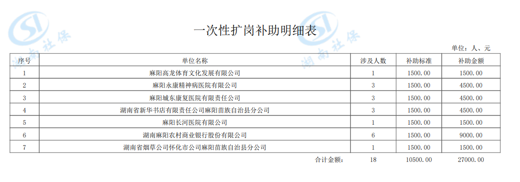 一次性扩岗补助发放公示 麻阳苗族自治县人民政府 http://www.mayang.gov.cn 发布时间: 2026-01-15 08:44 【字体:大 小】 分享到 来源:麻阳县人力资源和社会保障局 作者:
