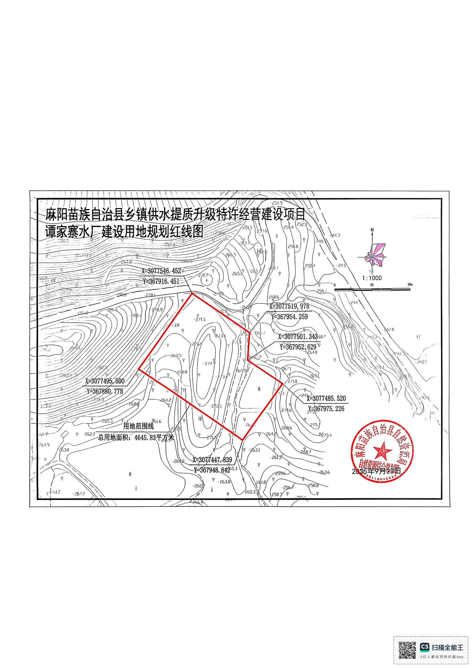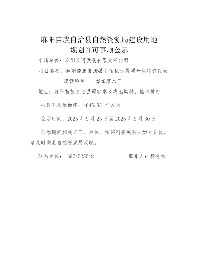建设用地规划许可事项公示(谭家寨水厂) 麻阳苗族自治县人民政府 http://www.mayang.gov.cn 发布时间: 2025-09-23 10:51 【字体:大 小】 分享到 来源:麻阳县自然资源局 作者: