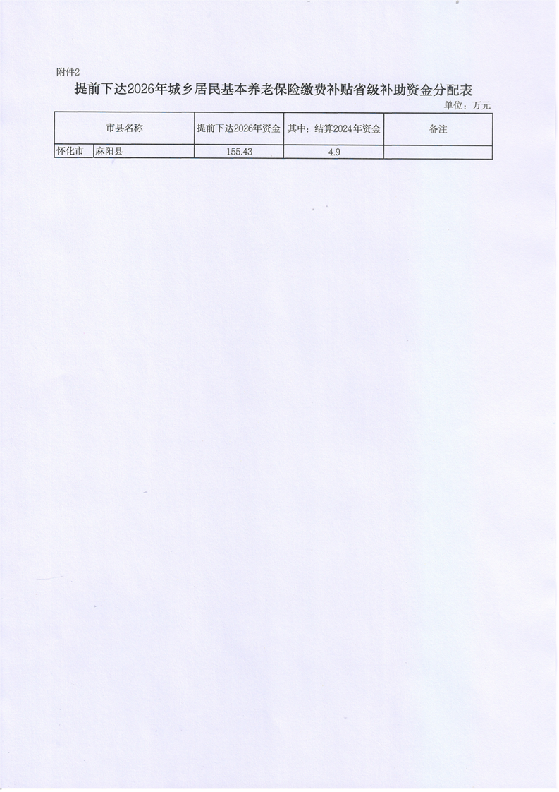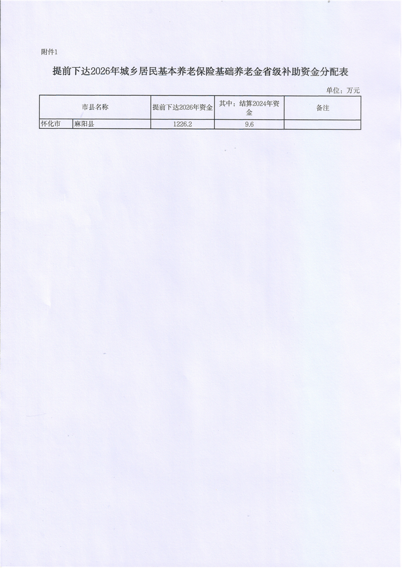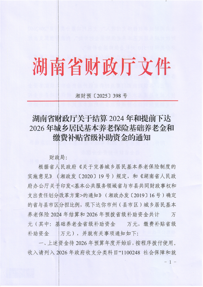 湖南省财政厅关于结算2024年和提前下达2026年城乡居民基本养老保险基础养老金和缴费补贴省级补助资金的通知 麻阳苗族自治县人民政府 http://www.mayang.gov.cn 发布时间: 2026-01-12 14:43 【字体:大 小】 分享到 来源:麻阳县财政局 作者:
