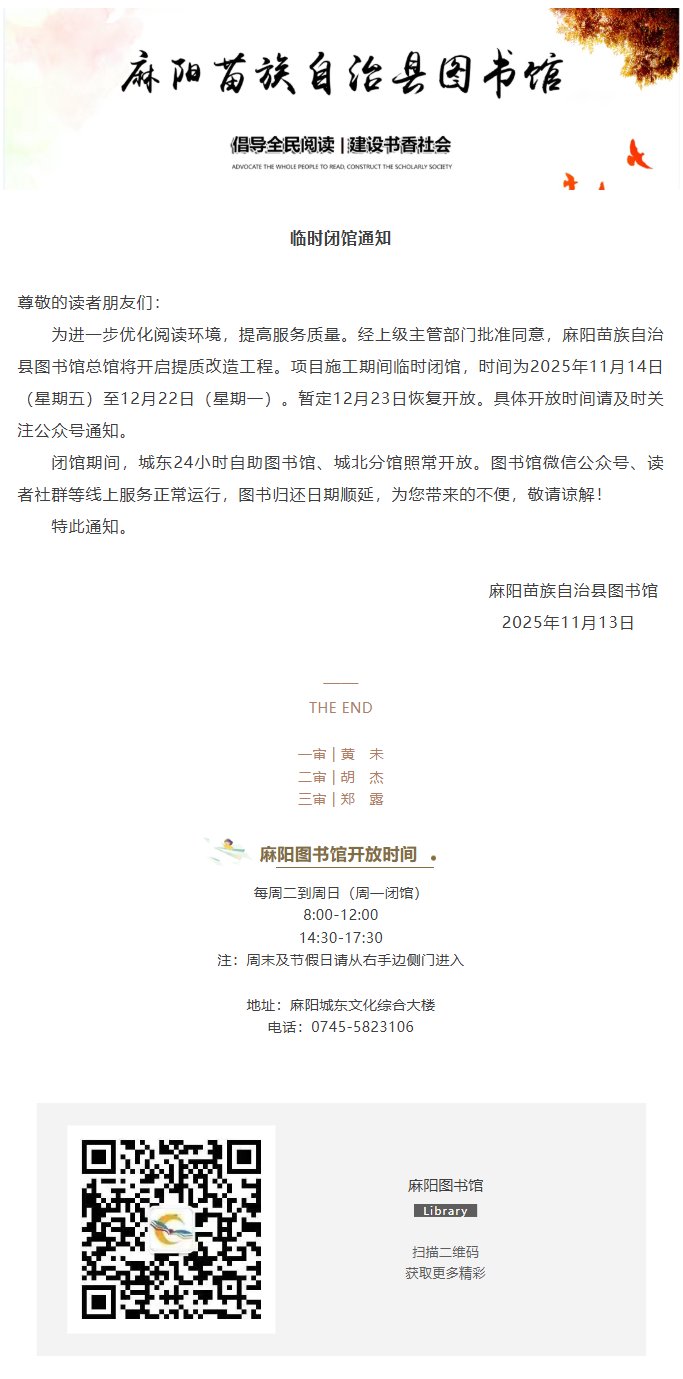 麻阳图书馆临时闭馆通知