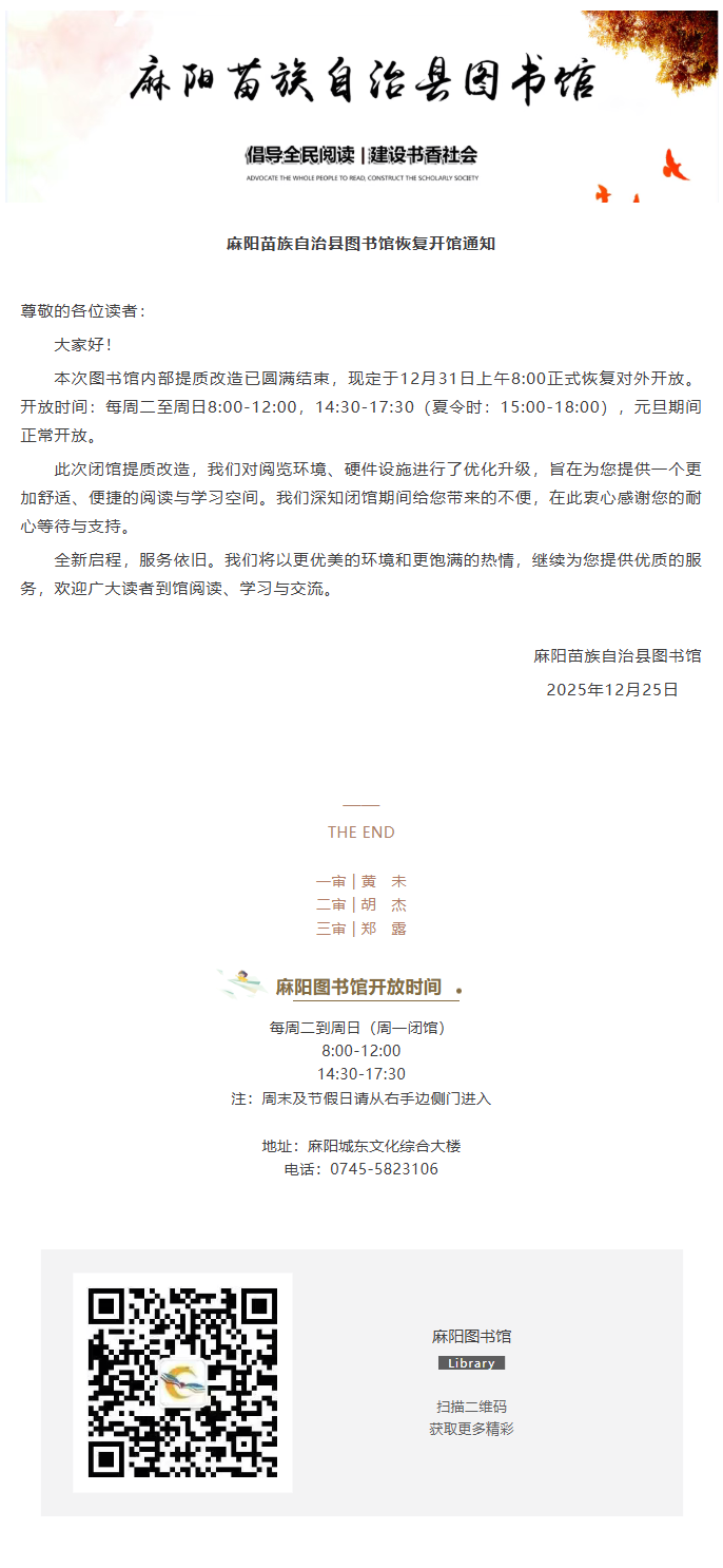 麻阳苗族自治县图书馆恢复开馆通知 麻阳苗族自治县人民政府 http://www.mayang.gov.cn 发布时间: 2025-12-25 14:16 【字体:大 小】 分享到 来源:麻阳图书馆 作者: