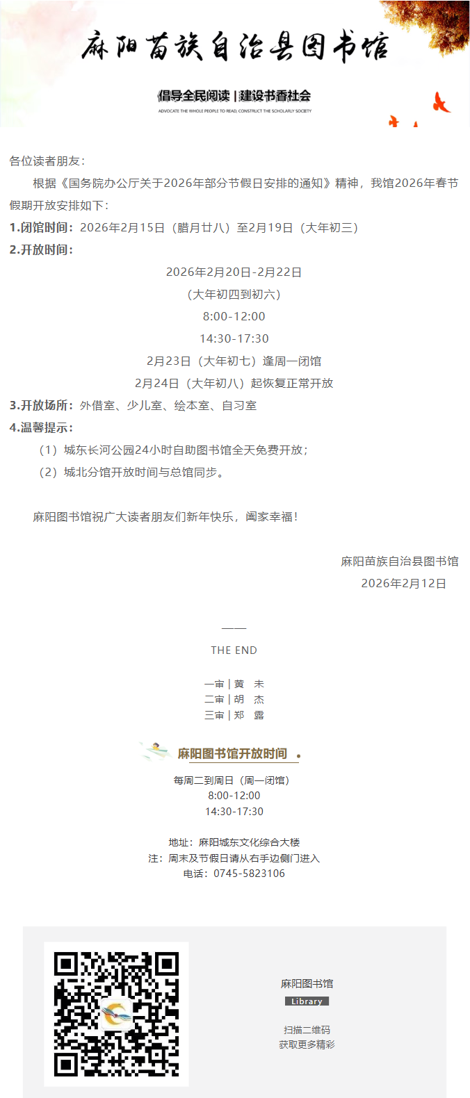 麻阳图书馆2026年春节假期开放安排 麻阳苗族自治县人民政府 http://www.mayang.gov.cn 发布时间: 2026-02-12 15:12 【字体:大 小】 分享到 来源:麻阳图书馆 作者:
