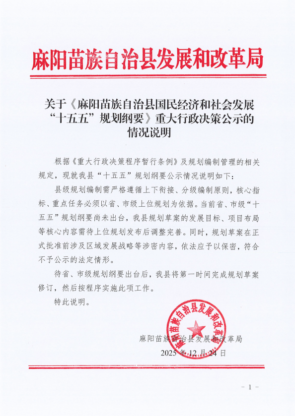 关于麻阳苗族自治县人民政府2025年度重大行政决策事项目录的情况说明 麻阳苗族自治县人民政府 http://www.mayang.gov.cn 发布时间: 2025-12-26 11:12 【字体:大 小】 根据《县人民政府办公室关于印发<麻阳苗族自治县人民政府2O25年度重大行政决策事项目录>的通知》(麻政办函〔2025〕6号)文件要求,2025年重大行政决策事项应按照计划在县政府门户网站上进行公示。到目前为止,还有一项相关重大行政决策事项未能公示。现将情况说明如下: 分享到 来源:麻阳县政务服务中心 作者: