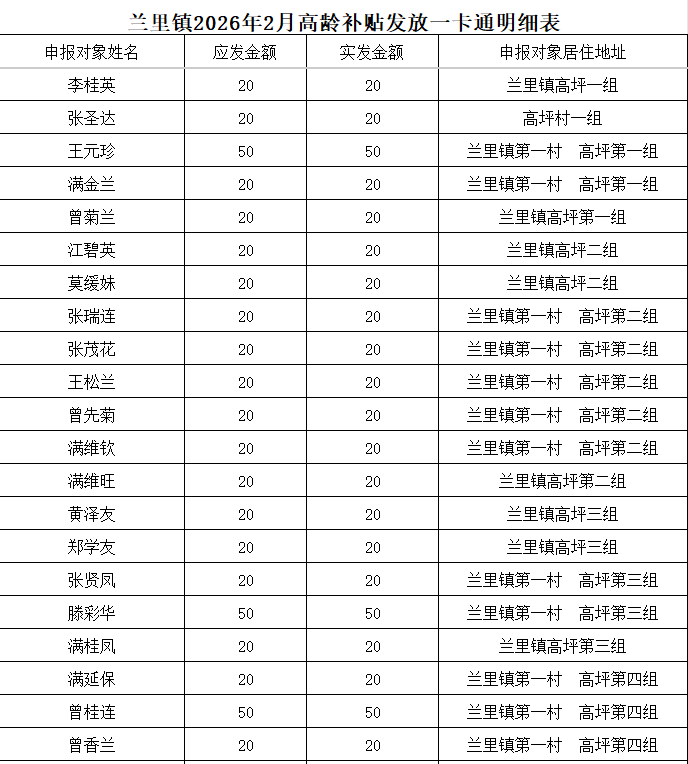 【养老服务】兰里镇2026年2月高龄补贴发放一卡通明细表 麻阳苗族自治县人民政府 发布时间: 2026-02-12 11:41 【字体:大 小】 备注:正文只展示部分信息,完整信息请下载附件浏览 附件:【养老服务】兰里镇2026年2月高龄补贴发放一卡通明细表 分享到 来源:麻阳县兰里镇 作者: