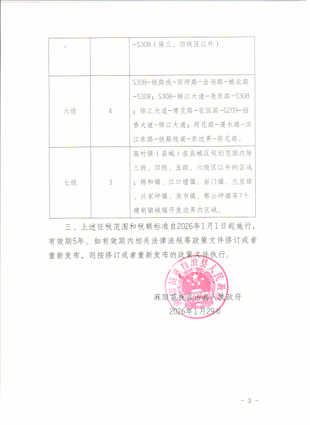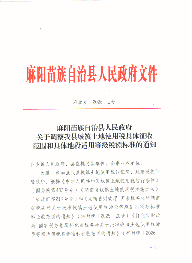 麻阳苗族自治县人民政府关于调整我县城镇土地使用税具体征收范围和具体地段适用等级税额标准的通知 麻阳苗族自治县人民政府 http://www.mayang.gov.cn 发布时间: 2026-02-03 11:16 【字体:大 小】 分享到 来源:麻阳县财政局 作者:
