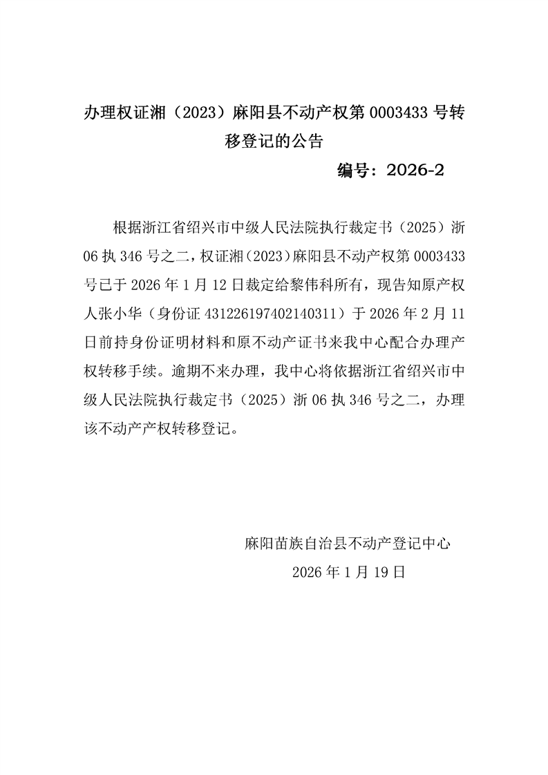 办理张小华权证号0003433号转移登记的公告 麻阳苗族自治县人民政府 http://www.mayang.gov.cn 发布时间: 2026-01-19 15:50 【字体:大 小】 分享到 来源:麻阳县自然资源局 作者: